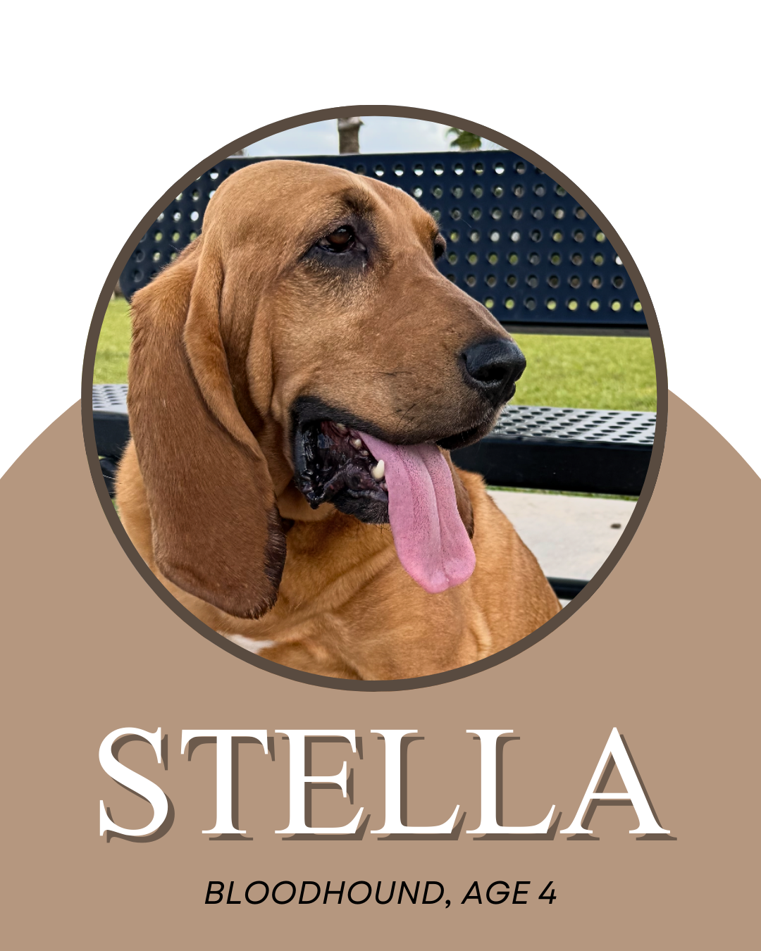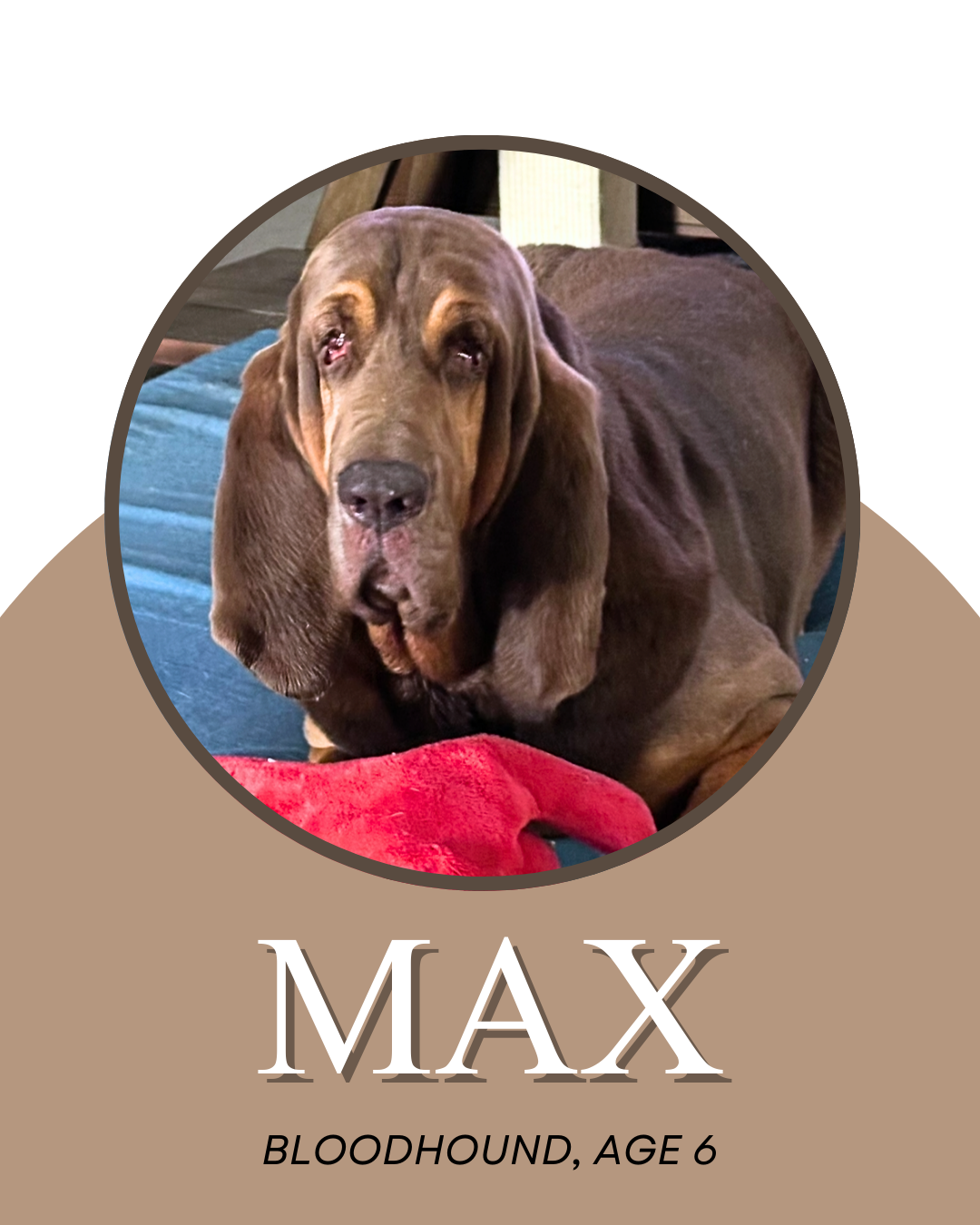 Meet Max, our gentle giant and resident teddy bear. He is a 6-year-old liver and tan Bloodhound with a sweet, calm personality that wins everyone over. In his younger years, Max was kicked by a horse, and as he has aged, he has developed mobility issues in his back end.