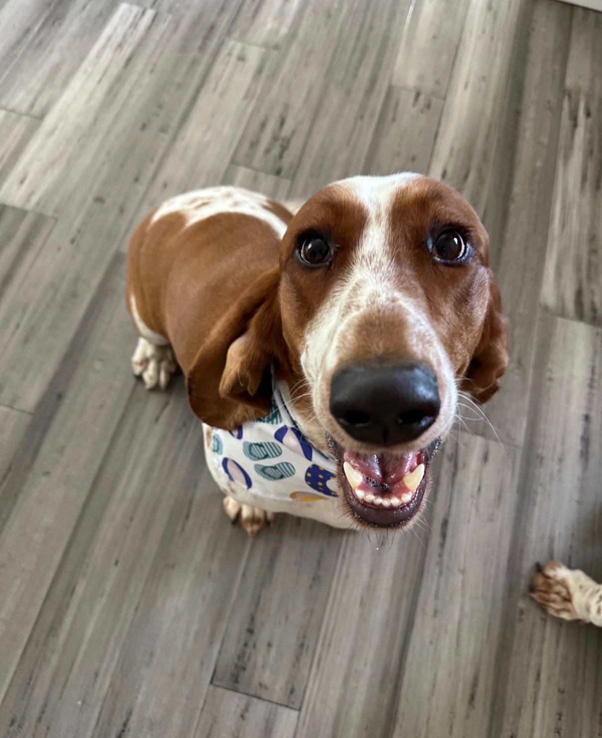 He’s around 60lbs, neutered, and up to date on vaccines. He gets along with everyone – children, dogs, cats. He’s a chatty boy and makes sure to community well with his basset voice.
