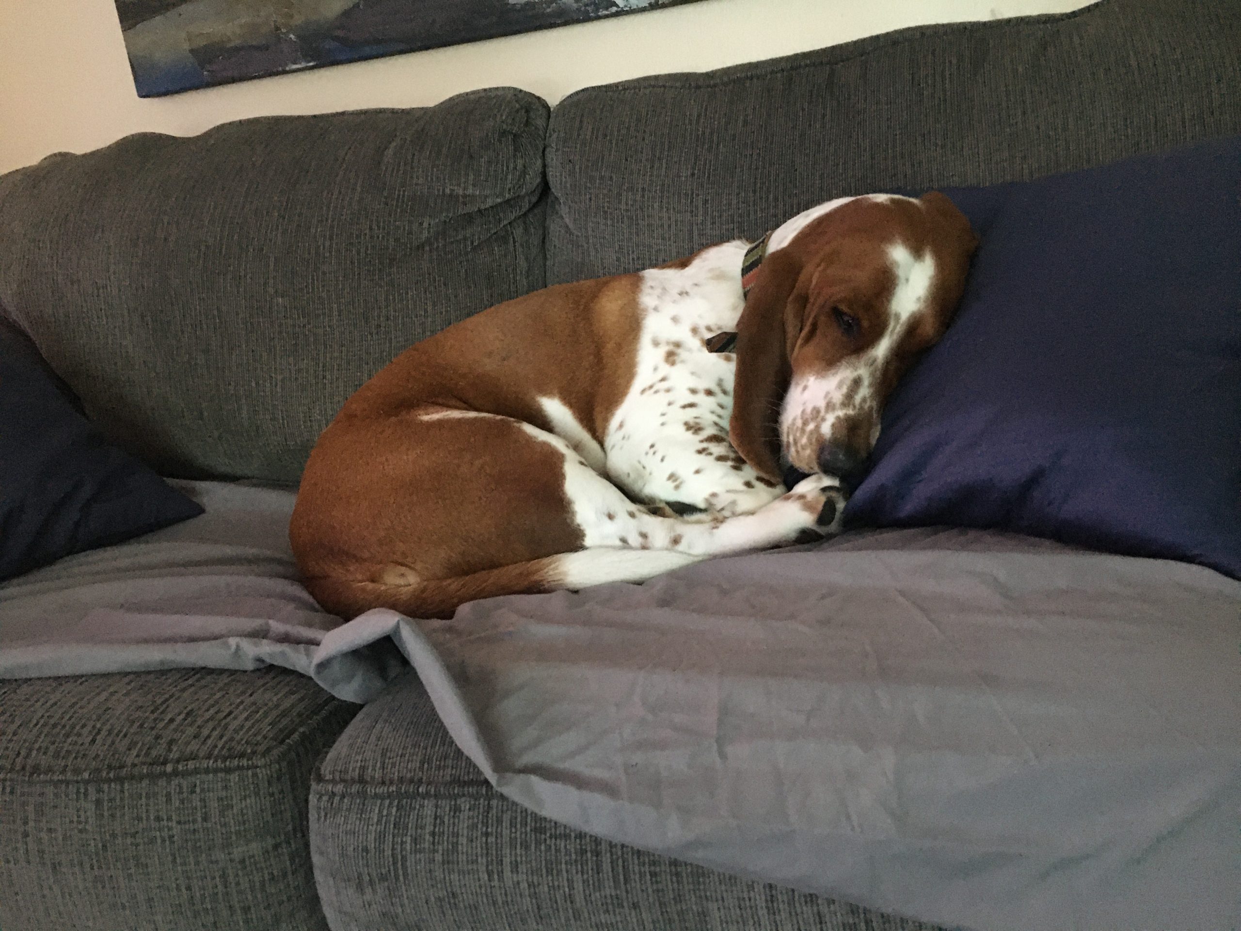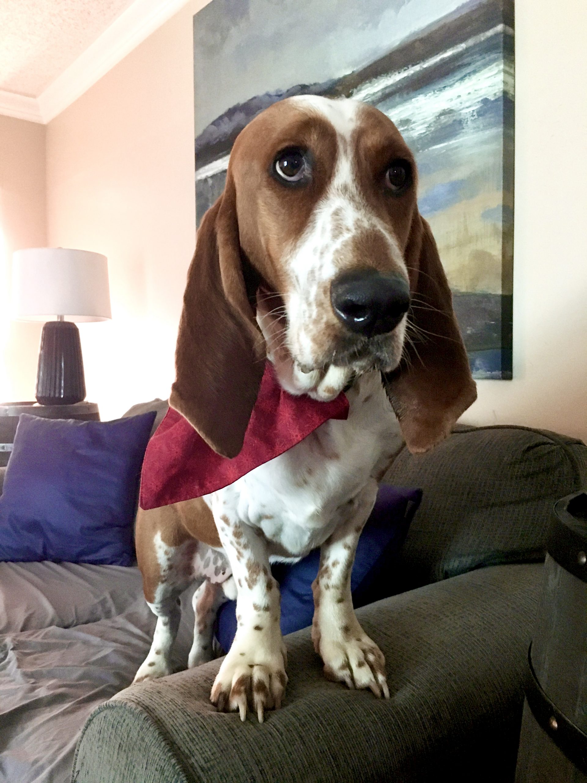Morris is potty trained and does very well with that. He was crate trained as a puppy, but hasn’t utilized a crate in years. He slept in his dog bed in the living room and was happy as a clam. He will bark sometimes, but his motive is always to receive attention. This guy *loves* attention (most bassets do), understands most basic commands and he walks well on a leash. He’s also not a food aggressive kind of guy.
